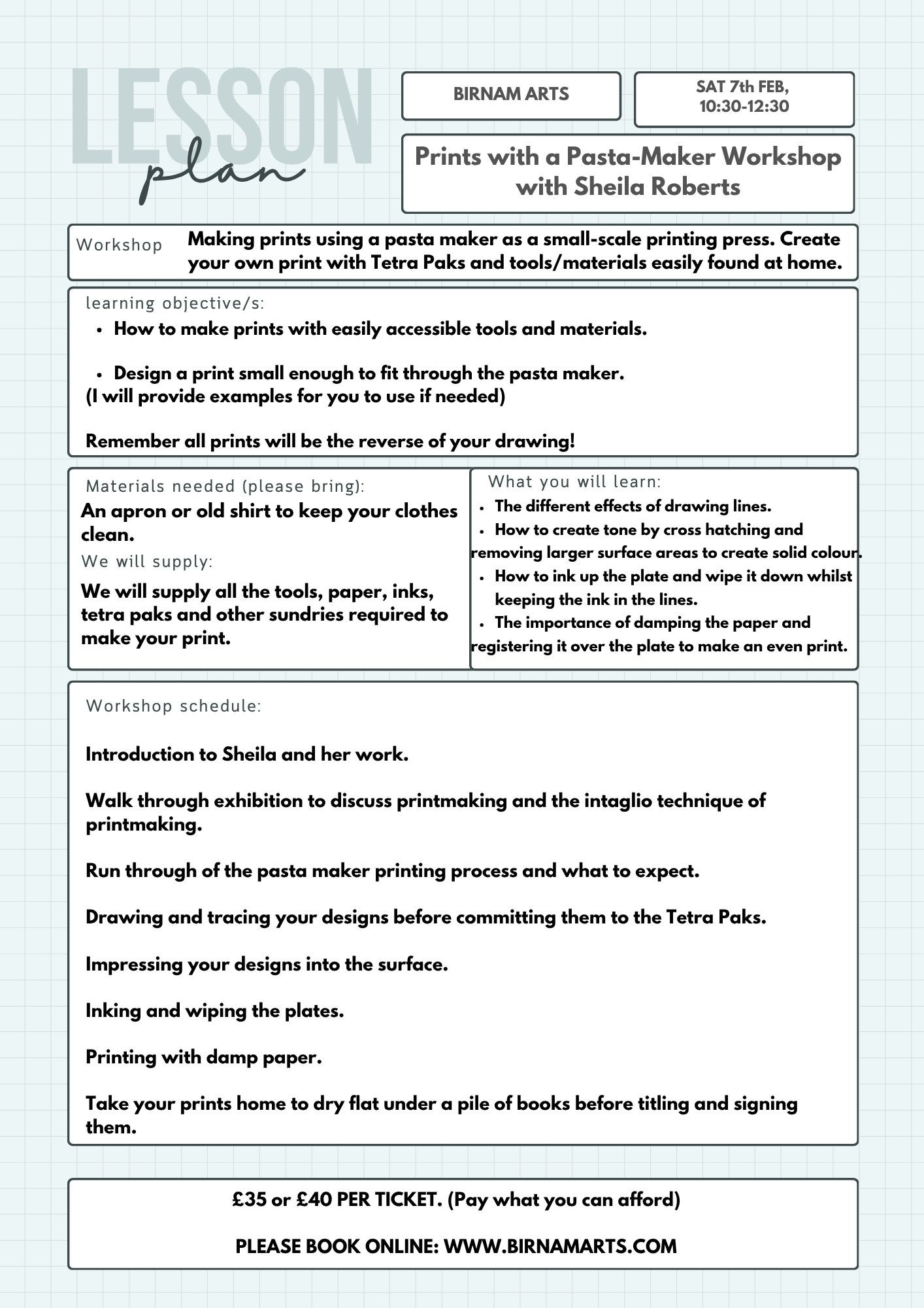 Join exhibiting artist Sheila Roberts for a workshop showing you how to make beautiful prints using a humble pasta maker.